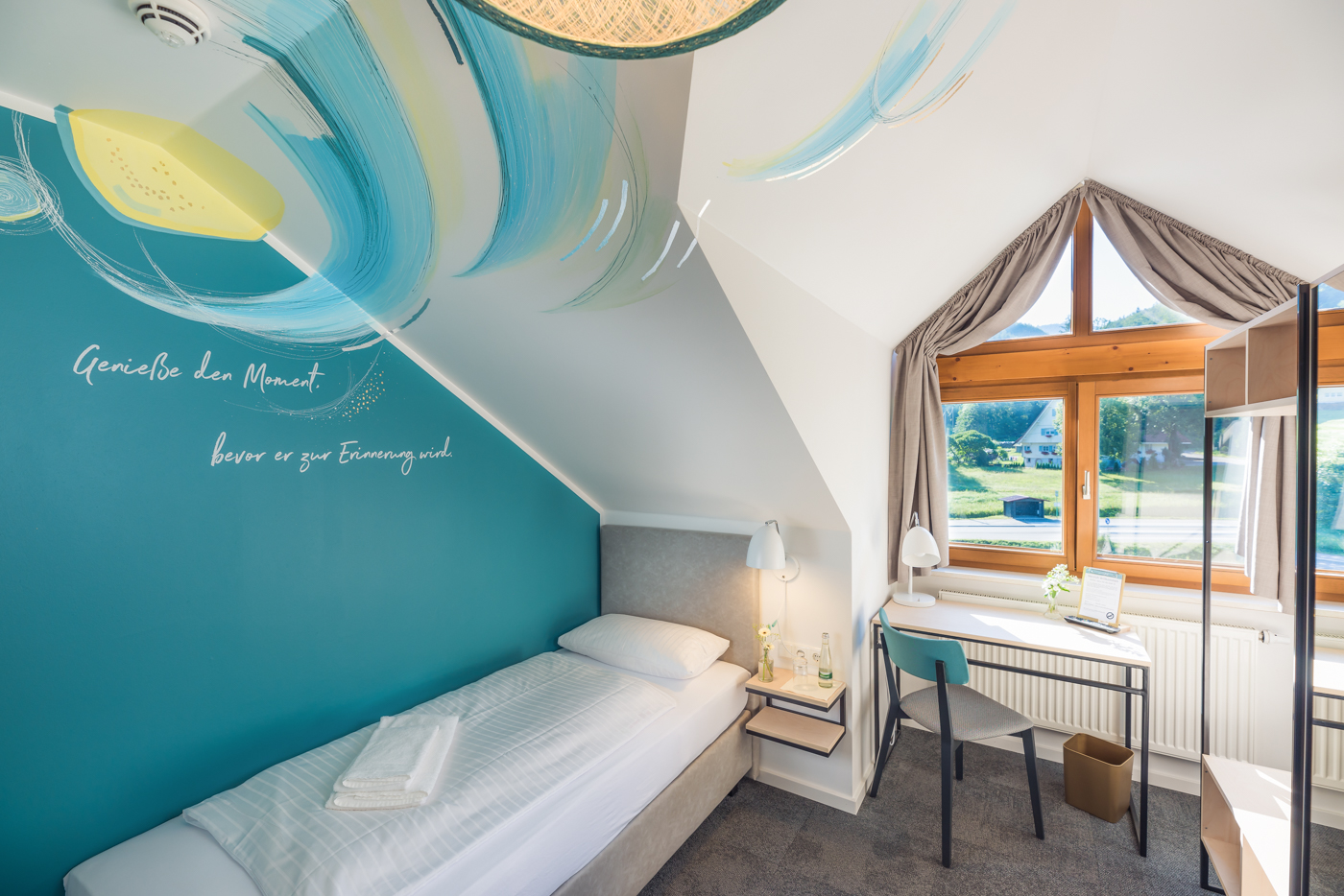 Schönes Einzelzimmer mit Bergblick - 12 m², geschmackvolle und moderne Einrichtung, Walk-in-Dusche, Schreibtisch, Flat-TV, gratis WLAN, Föhn, inklusive Frühstücksbuffet.